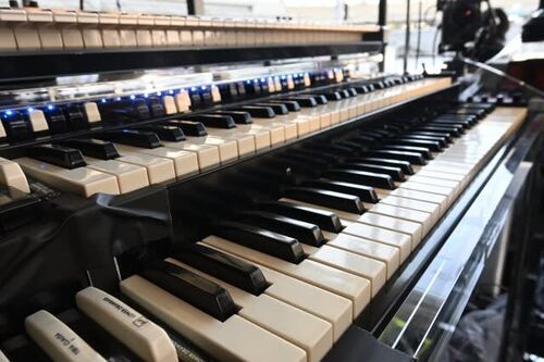 こういう、鍵盤でぐるっと回りを囲むセッティングを「要塞型」とかっていうのですが(しかも今は結構レアかもです)、 今回のツアーでのセットです。ちょっと手前にある機材が見えておりませんが、そちらは、またいずれ。 僕は昔からこの形(コの字型、とも…