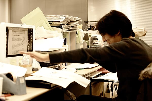 編集部にて。「ちょ、ちょっと待ってください!」の図。よくわかりませんが、なんかそんな感じ。ボケてますけど、なんとなく面白いので採用(笑)。