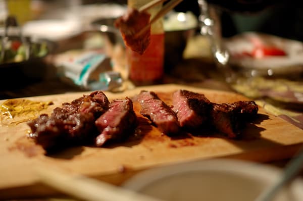 焼きたてのステーキを、豪快にまな板の上でザクッ、ザクッ。染み渡ります。生き返ります。ひたすら、感謝。牛さん(それトナカイ)、石坂さん(もっと若い)、ありがとうございまーす。